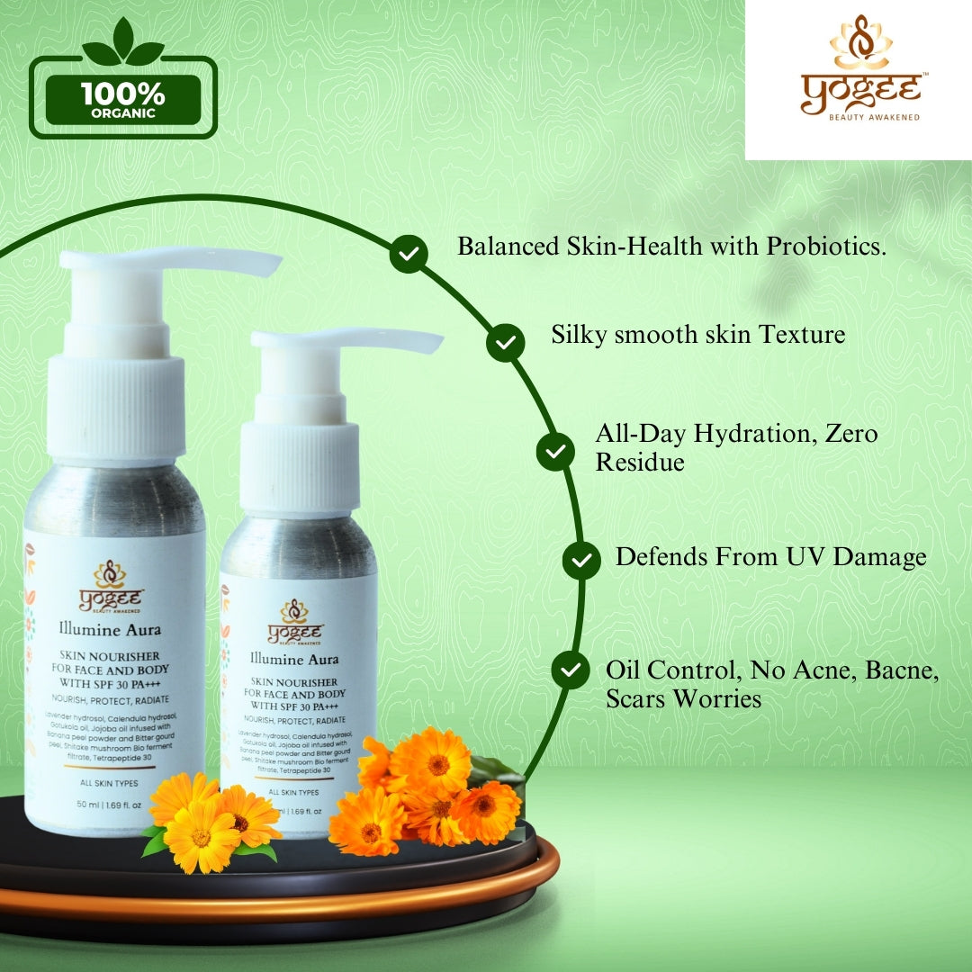 Experience the transformative power of Illumine Aura, a 100% natural organic Ayurvedic Skin Nourisher. Nourish, protect, and replenish your skin from head to toe with its harmonious blend of pre and probiotics. Combat acne, banish bacne, soothe scars, sun protection, and enjoy intense hydration and de-tanning benefits.