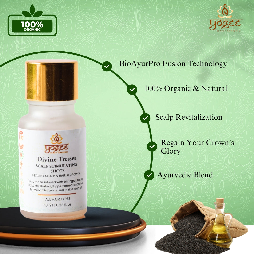 YOGEE Divine Tresses Scalp Stimulating Shots - 100% Natural Organic Sustainable Hair Regrowth Solution Product Description: Revitalize your hair and promote regrowth with YOGEE DivineTresses Scalp Stimulating Shots, a powerful 100% natural, organic, and sustainable hair care solution. This unique formula combines the ancient wisdom of Ayurveda, the innovation of Green Chemistry, and the advancements of Biotechnology to provide an effective and holistic approach to hair regrowth.