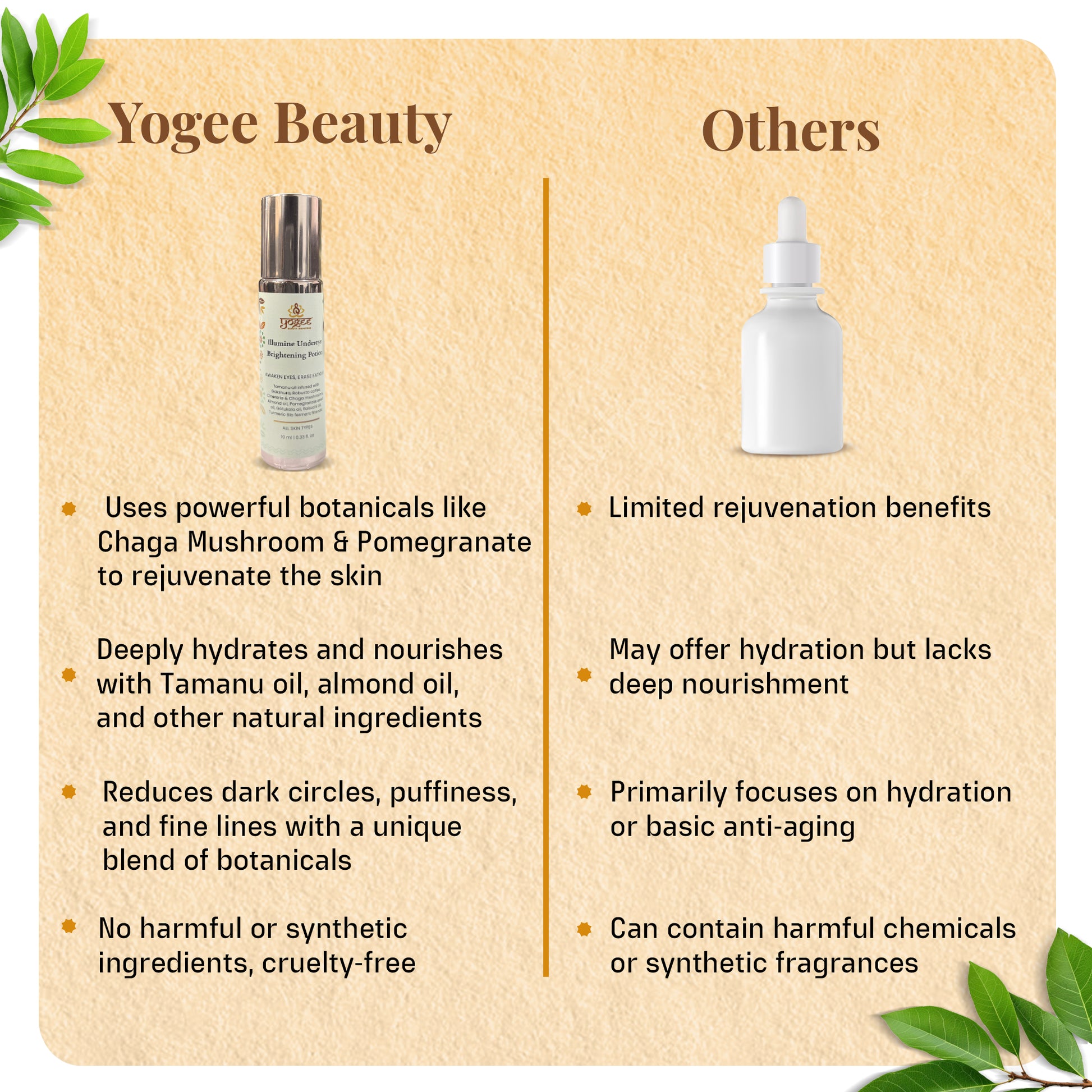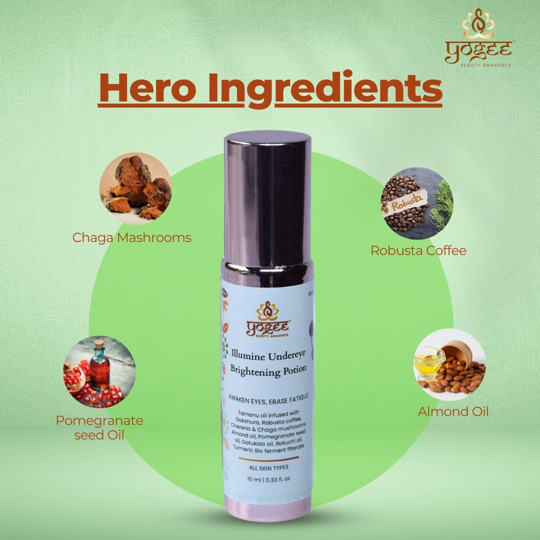 Unlike heavy, chemical-based eye creams, Illumine Undereye Brightening Potion is a fast-absorbing, lightweight elixir that deeply penetrates the skin without clogging pores or causing irritation. Its bio-fermented botanicals and adaptogenic mushrooms provide long-lasting hydration, while powerful Ayurvedic oils work at the cellular level to restore brightness, firmness, and smoothness.